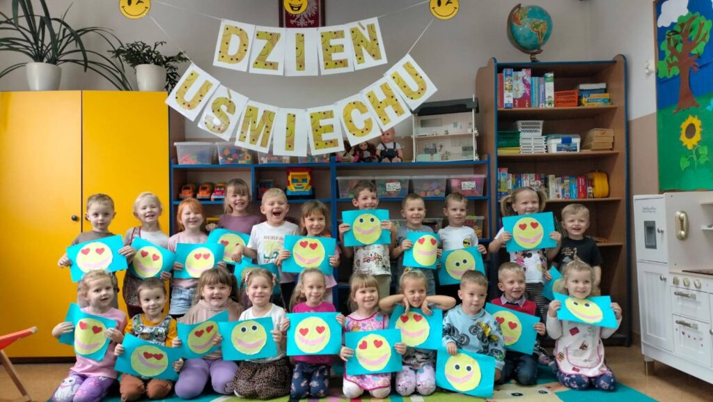 Dzisiejszy dzień w przedszkolu upłynął pod znakiem radości i pozytywnej energii – obchodziliśmy Światowy Dzień Uśmiechu. Już od samego rana panowała wesoła atmosfera – dzieci witały się z uśmiechem , a wychowawca przypominal jak ważny jest dobry humor i życzliwość wobec innych. Zarówno zabawy dydaktyczne jak i praca plastyczna skupiły się wokół motywu uśmiechu, który towarzyszył dzieciom cały dzień. Przedszkolaki nauczyły się , że uśmiech nic nie kosztuje , a potrafi sprawić , że świat staje się piękniejszy.
