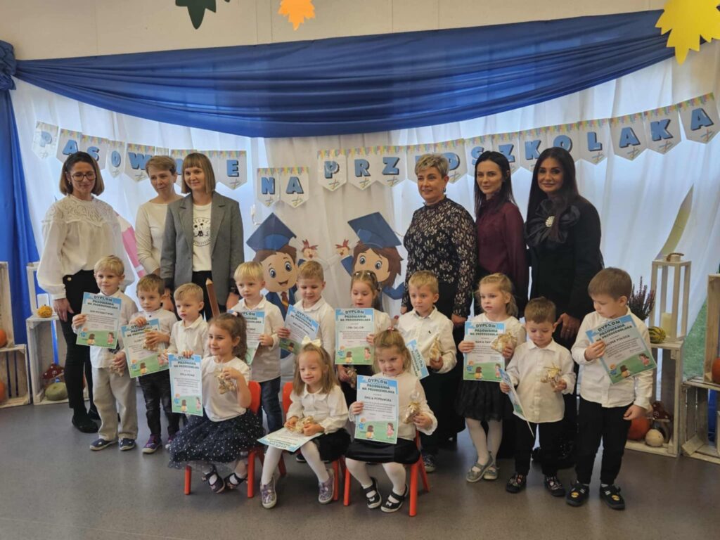 Po części artystycznej nastąpił najważniejszy moment – akt pasowania. Pani Dyrektor symbolicznie dotykała każde dziecko dużym ołówkiem, wypowiadając słowa: „Pasuję Cię na przedszkolaka”. Dzieci z dumą i uśmiechem przyjmowały ten zaszczytny tytuł. Każdy nowo przyjęty przedszkolak otrzymał również pamiątkowy dyplom oraz drobny upominek.