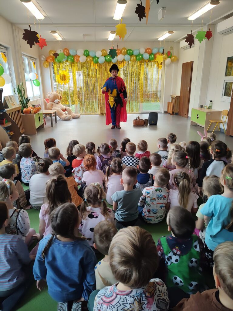 Najwięcej radości sprawiły wspólne zabawy – czarodziej zapraszał przedszkolaki do pomocy przy swoich trikach, dzięki czemu dzieci mogły na chwilę poczuć się jak prawdziwy magik. W sali rozbrzmiewał śmiech, oklaski i okrzyki zachwytu.
