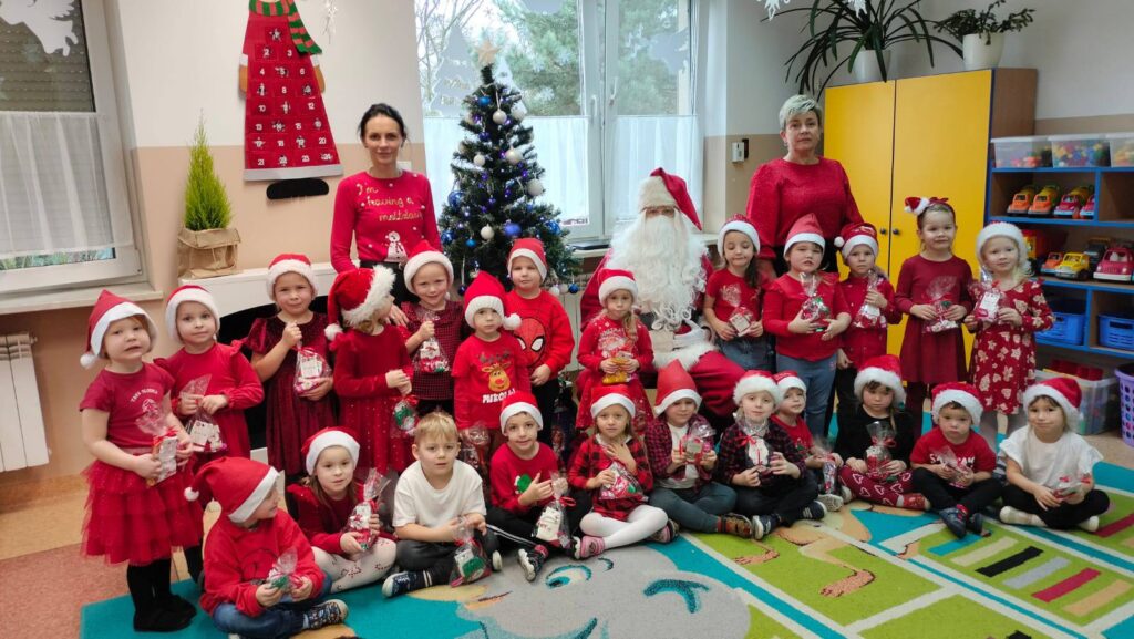 Wizyta Świętego Mikołaja w naszym przedszkolu to jeden z najbardziej wyczekiwanych przez dzieci dni w roku. Dziś od samego rana wszystkie dzieci ubrane w mikołajkowe czapki z wielką niecierpliwością czekały na specjalnego gościa w czerwonym stroju. Długo, oczekiwany gość wywołał uśmiech na twarzach przedszkolaków. We wszystkich grupach spotkanie przebiegało w bardzo miłej, przyjaznej atmosferze. Na zakończenie Święty Mikołaj osobiście przekazał prezenty wszystkim dzieciom. Święty Mikołaju, bardzo dziękujemy za odwiedziny i do zobaczenia za rok